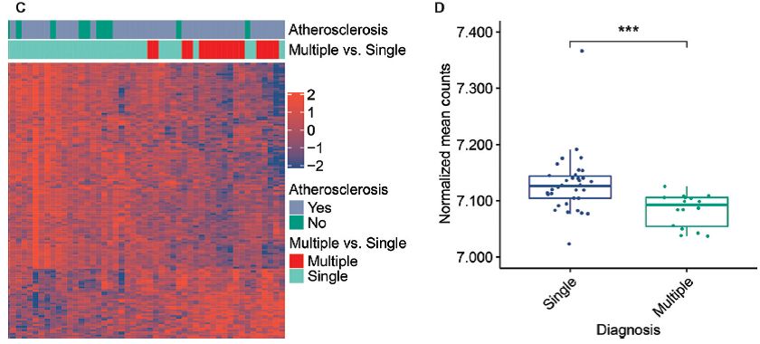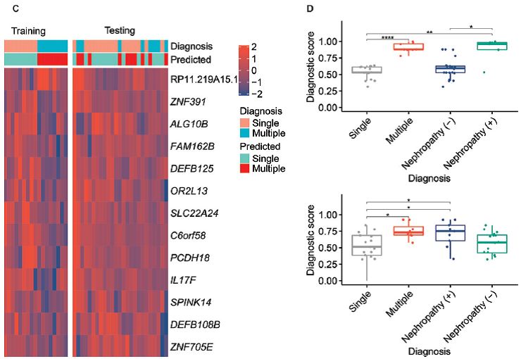之后将有单一并发症或多种并发症的50例病人用逻辑回归模型进行了对比,发现多种并发症的病人的153个差异修饰候选基因(包括上调和下调基因)的归一化平均数要低于无并发症病人(P<0.001)。