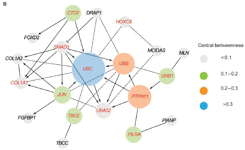 信号通路分析和功能探究 有并发症和无并发症病人的135个差异候选基因的功能注释分析表明,这些基因主要富集在一些经典的信号通路。错误发现率相关P值位于前10%和基因数目≥3的信号通路包括由IGF1R, IL-10和FGFR2所介导的信号通路。由IGF1R和IL-10介导的信号通路与胰岛素抵抗及炎症反应相关,在血管生物学和糖尿病发生发展过程中发挥重要作用。 Reactome相互作用网络的中心表明,泛素编码基因[泛素B (UBB),泛素C (UBC),泛素A-52亚基核糖体蛋白融合产物1(UBA52)]是候选基因(如SMAD3, FOXD2, DRAP1, MCIDAS, MLN, PIANP和TBCC)的重要连接者。在这135个差异候选基因中, 一些基因 (如TNFRSF25,P=0.027, HR=6.25; MLN, P=0.0021, HR=20.40; CCL3L1, P=0.018, HR=0.44)表现出与糖尿病病程相关的倾向,表明5hmC和糖尿病血管并发症之间可能存在时间依赖性的相互作用。基于纵向时间队列的大样本研究,将可进一步明确5hmC变化和糖尿病持续时间之间的动态关联。关于单一并发症和多种并发症病人的159个候选标志基因的功能注释研究发现,存在细胞-细胞连接、胶原蛋白形成、新陈代谢、细胞应激应答信号通路的富集,这些信号通路均与细胞基本功能密切相关。 研究意义 血管并发症是三分之二糖尿病病人的死亡原因,若能及早有效控制血管并发症的发生,将极大地改善糖尿病病人的生存质量。该研究建立了一种利用cfDNA进行2型糖尿病血管并发症监测的无创便捷方法,较目前临床标志物能更准确地监控血管并发症的发生,从而提示临床及早采取应对措施,有效控制病情进展。